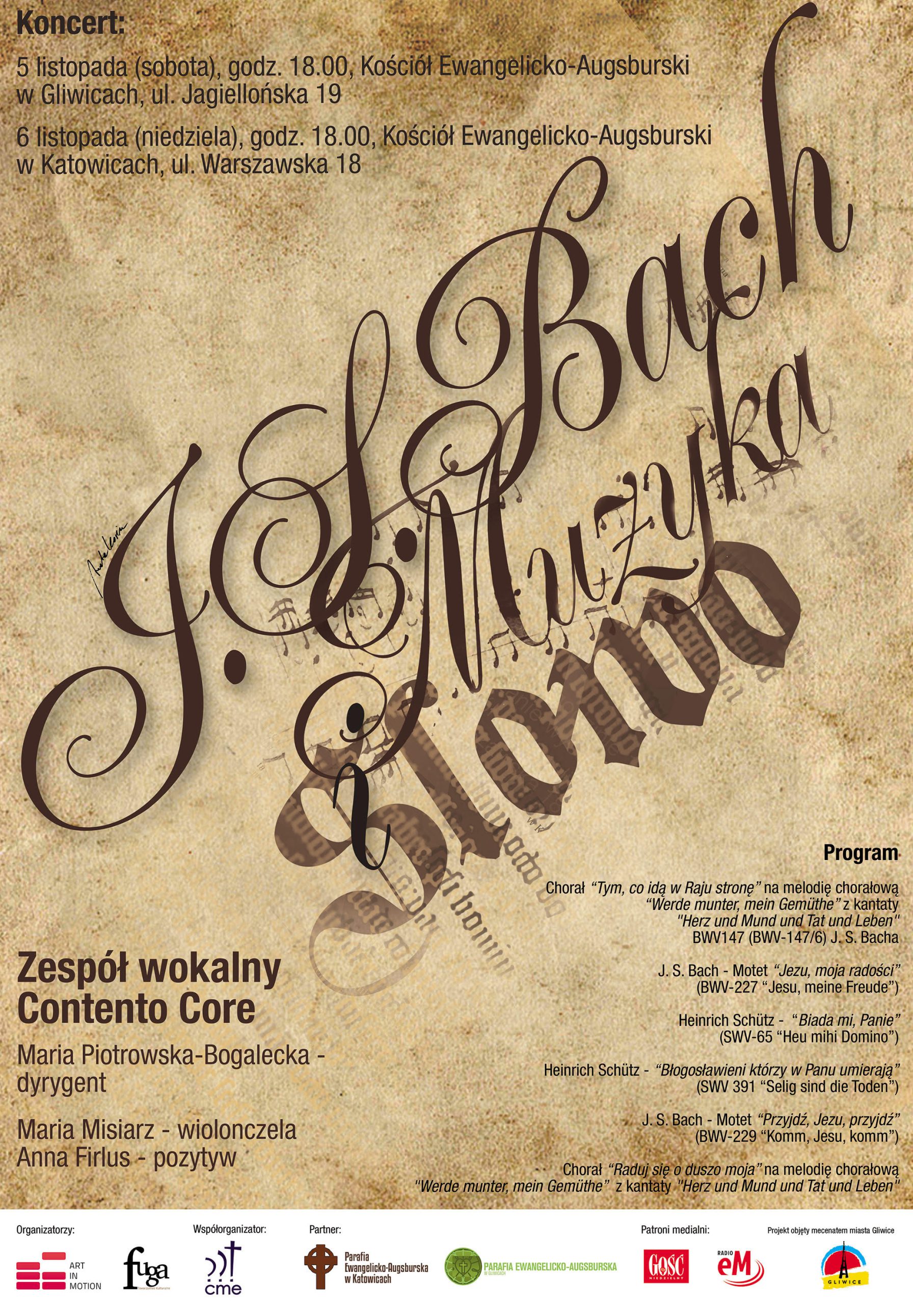 Koncert to kolejna inicjatywa z cyklu „Muzyka i Słowo” realizowana przez Stowarzyszenie „Art In Motion” we współpracy z parafiami ewangelickimi. Pierwsze koncerty z muzyką Jana Sebastiana Bacha i zawartym w niej Słowem odbyły się w maju 2016 r. w Kościele Ewangelickim w Katowicach przy udziale Orkiestry Historycznej, znakomitych solistów i Zespołu Wokalnego Contento Core przyciągając pełne ławy słuchaczy. Tym razem, 5 listopada w Gliwicach, a 6 listopada w Katowicach, w bardziej kameralnym repertuarze ponownie zaprezentował się Zespół Wokalny Contento Core pod dyr. Marii Piotrowskiej-Bogaleckiej, wykonując motety Bacha oraz utwory innego niemieckiego kompozytora Heinricha Schűtza. Zespołowi towrzyszyły: Anna Firlus (pozytyw) i Maria Misiarz (wiolonczela) realizujące partie basso continuo.