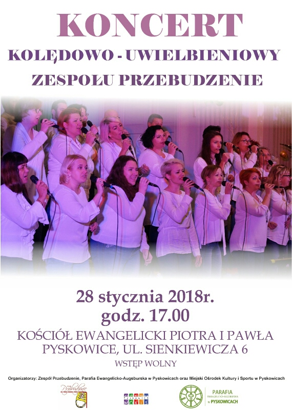 28 stycznia 2018 r. w ewangelickim kościele Piotra i Pawła odbył się niecodzienny koncert zespołu gospelowego Przebudzenie z Pyskowic. Zespół zaprezentował pieśni uwielbieniowe, kolędy i pastorałki. Zespołem Przebudzenie dyrygował instruktor Adam Wójcik – zastępca burmistrza miasta Pyskowice, a Słowem dzielił się ks. Andrzej Wójcik – proboszcz administrator pyskowickiej parafii, który miedzy innymi zachęcił (inicjatywa ewangelickich parafian w Pyskowicach) do modlitwy o zdrowie Burmistrza Miasta p. Wacława Kęski. Koncert cieszył się dużym powodzeniem – mimo ferii dostawialiśmy krzesła i część przybyłych musiała stać. Jednak… było warto! Bogu i zespołowi Przebudzenie jesteśmy wdzięczni za to piękne uwielbienie i energię płynącą z głębi serc!