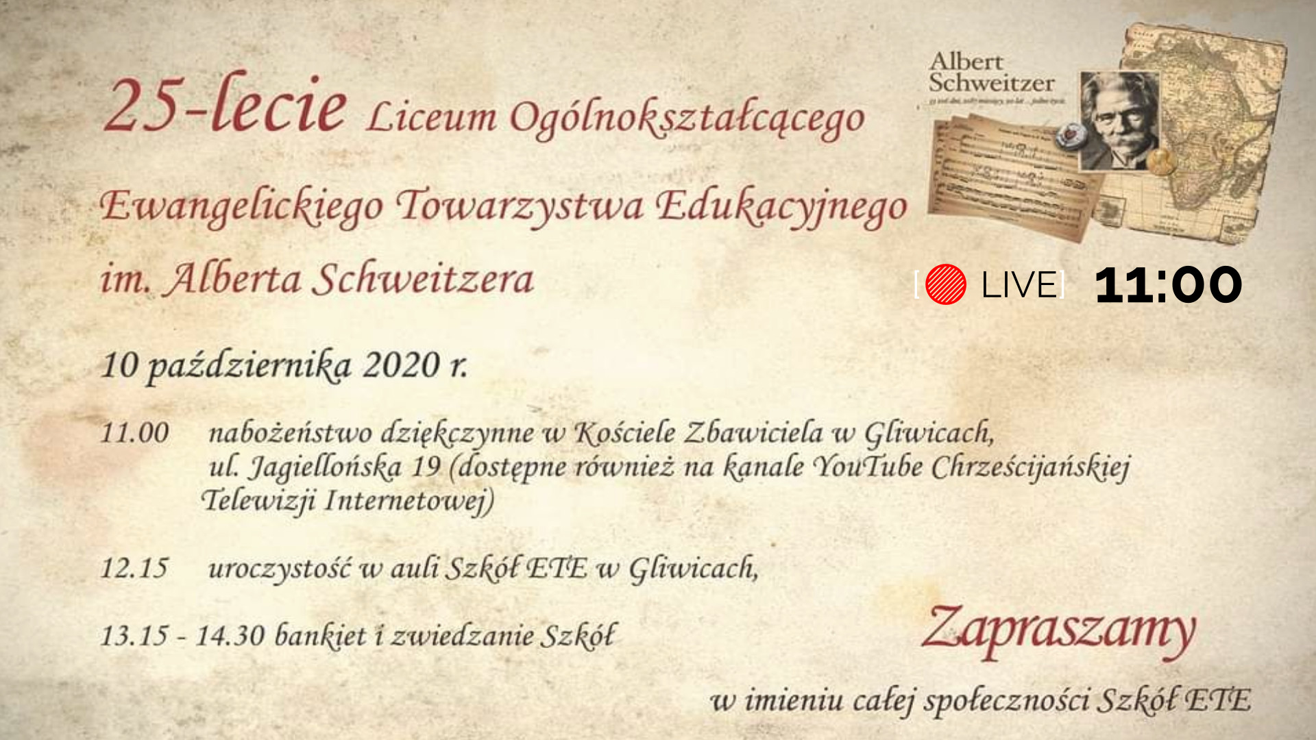 Serdecznie zapraszamy 10 października (w sobotę) o godz. 11.00 do Kościoła Zbawiciela w Gliwicach na nabożeństwo dziękczynne z okazji 25-lecia istnienia Liceum Ogólnokształcącego Ewangelickiego Towarzystwa Edukacyjnego. Po nabożeństwie o godz. 12.15 w auli szkół ETE, przy ul. Franciszkańskiej 5, odbędą się uroczystości a od 13.15 do 14.30 będzie możliwe zwiedzanie szkół i uczestnictwo w bankiecie.