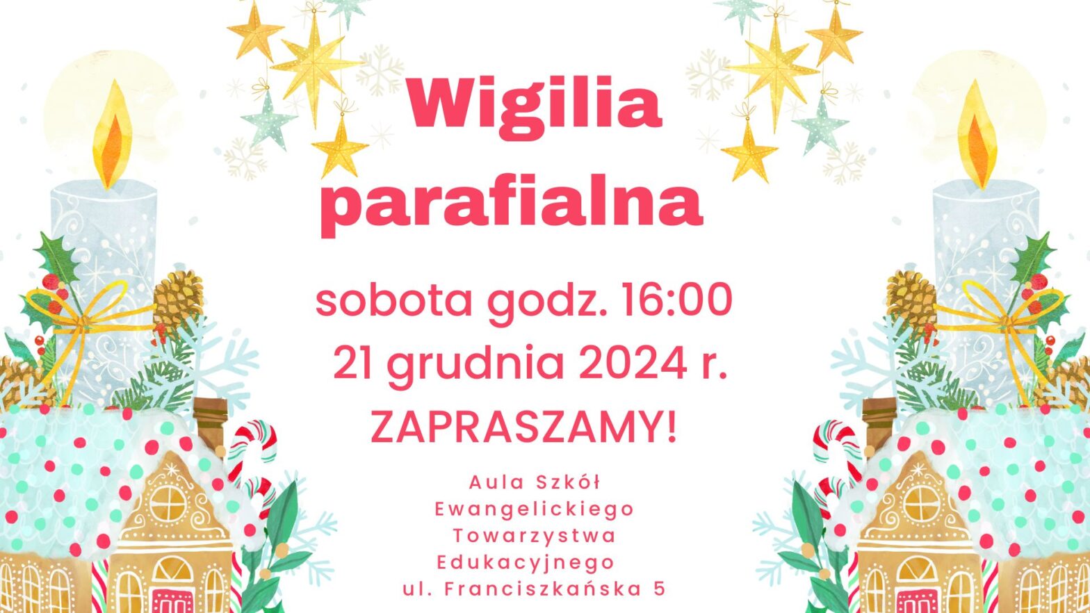 Serdecznie zapraszamy na tradycyjną Wigilię parafialną, która odbędzie się 21 grudnia 2024 r., w sobotę o godz.16:00 w auli Szkół Ewangelickiego Towarzystwa Edukacyjnego w Gliwicach.