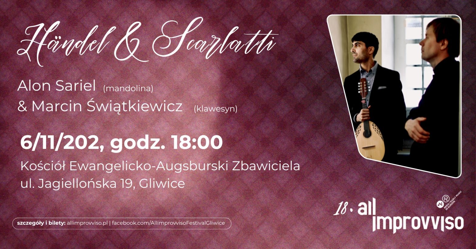 6 listopada 2025 roku (czwartek) o godz. 18:00 zapraszamy do kościoła Zbawiciela na koncert w ramach Międzynarodowego Festiwalu Muzyki Dawnej Improwizowanej – All Improvisso. Wystąpią: Alon Sarile (mandolina) i Marcin Świątkiewicz (klawesyn).
